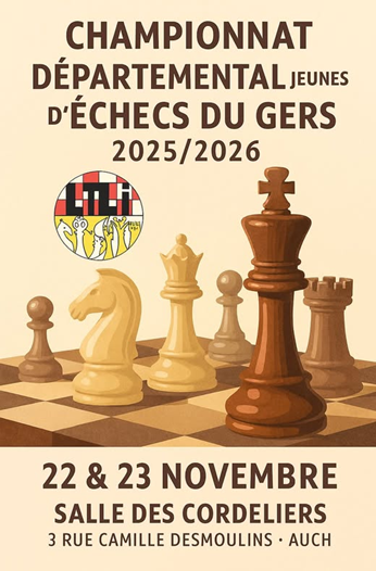 Dimanche 23 novembre de 13h15 à 17h30 à la salle des Cordeliers à Auch pour les enfants nés entre janvier 2010 et décembre 2015 inclus joueront 2 ou 3 parties en 50’+10″ avec notations des coups obligatoires.